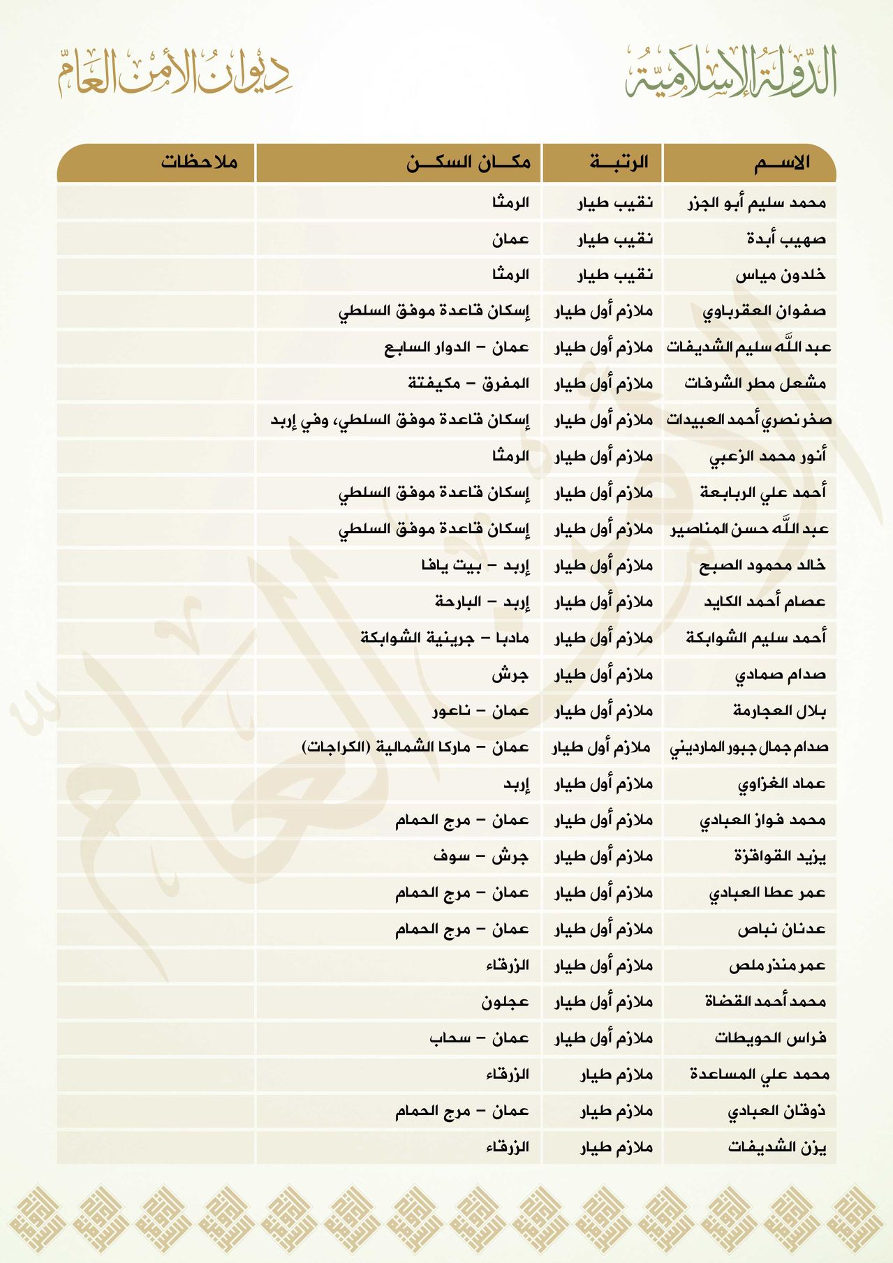 Di bawah ini Daftar nama-nama pilot Yordania disertakan pangkat, alamat dan informasi yang dapat memudahkan pemburuannya, data ini akurat dan utuh setelah dikuatkan oleh tahanan pilot koalisi salibis (Mu’adz Shafiy Al Kasasbeh).