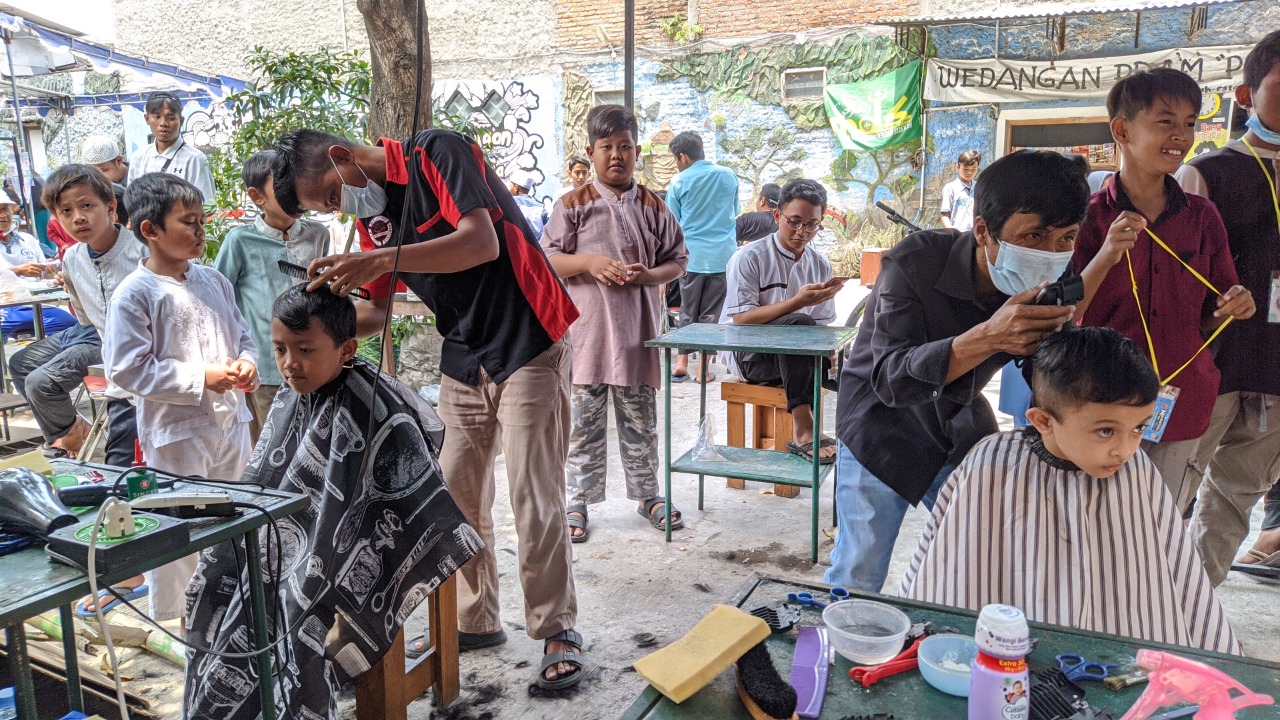 Ada yang tak kalah menarik dari acara ini. Dibawah tenda yang sejuk, terlihat beberapa peserta berjejer memanjang. Ternyata mereka antri memangkas rambutnya secara gratis oleh komunitas Pangkas Rambut Elite. Sepertinya anak-anak ini ingin menambah kegantengannya ketika pulang dari acara. Salah satu personil pangkas rambut bernama Didik, mengatakan bahwa dengan keikutsertaannya memeriahkan acara tersebut salah satu tujuannya adalah meningkatkan skil dan keterampilan. Ia rela menggratiskan jerih payahnya tersebut untuk bakti sosial.