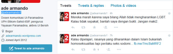 Ade melanjutkan argumennya melalui akun Twitter, @adearmando1. Merasa banyak yang menyerangnya, ia malah menantang balik para pihak yang tak setuju dengan pendapatnya. “Mereka marah karena saya bilang Allah tidak mengharamkan LGBT. Kalau tidak sepakat, bantah saya dengan bukti. Jangan maki2,” kata Ade. [RN]